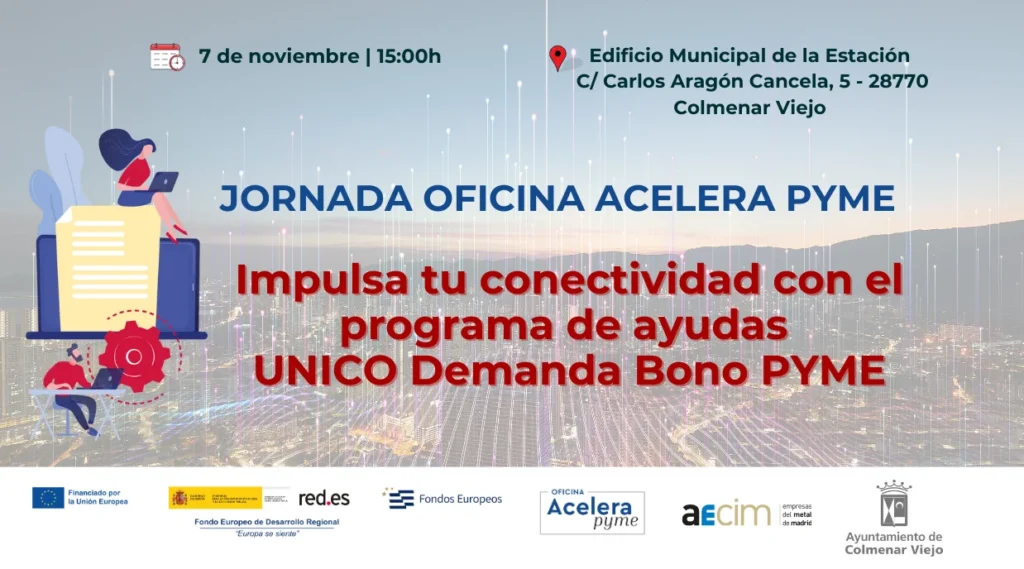 Desde la Oficina Acelera Pyme de AECIM, hemos organizado junto al Ayuntamiento de Colmenar Viejo, una jornada informativa sobre el Programa ÚNICO Demanda Bono PYME, una iniciativa del Gobierno de España, cuyo objetivo es subvencionar la implantación de servicios y soluciones de conectividad digital. En esta sesión, mostraremos todo lo que necesitas saber sobre cómo acceder a estas subvenciones y qué pasos seguir para aprovecharlas al máximo. ¡No te lo pierdas!